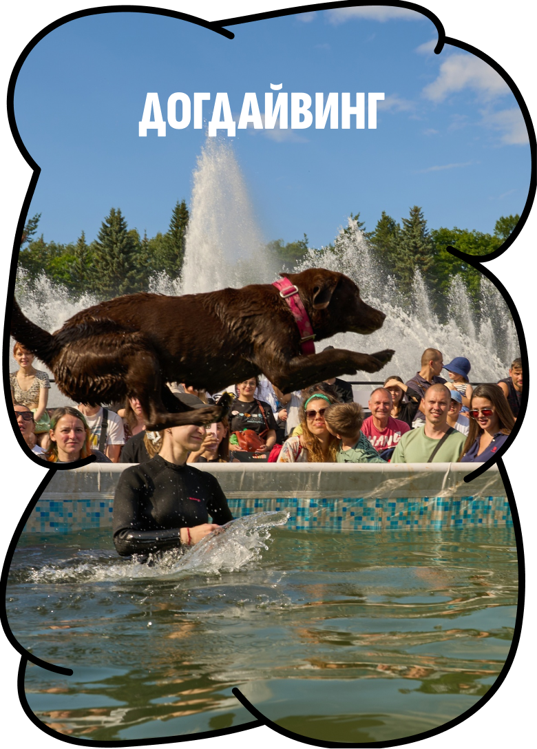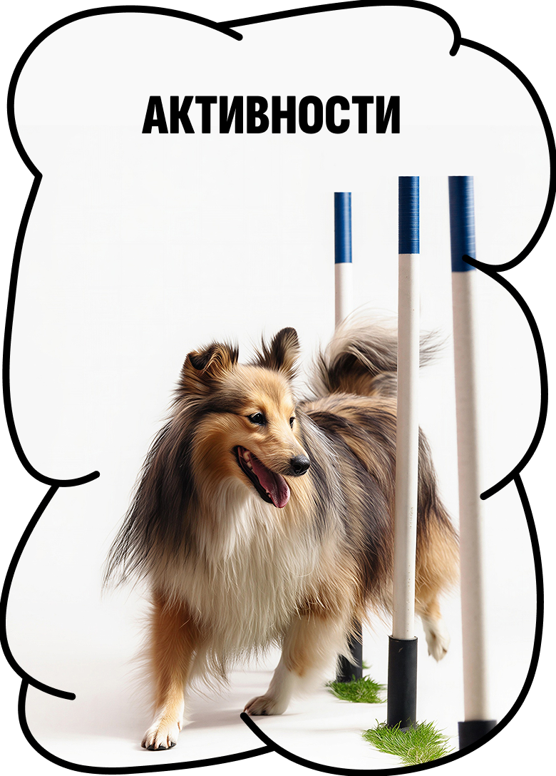 1 Маркет* – рынок, 2 Курсинг* – бег собак за механической приманкой, 3 каникросс* – бег человека с собакой, 4 докдайвинг* – прыжки собак в воду, 5 ноузворк* – поиск запахов, 6 фризджилити* – комбинация фрисби* и аджилити*, аджилити* – полоса препятствий для собак, фрисби* – летающий диск, 7 сап-серфинг* – серфинг с веслом, серфинг* – вид водного спорта на доске